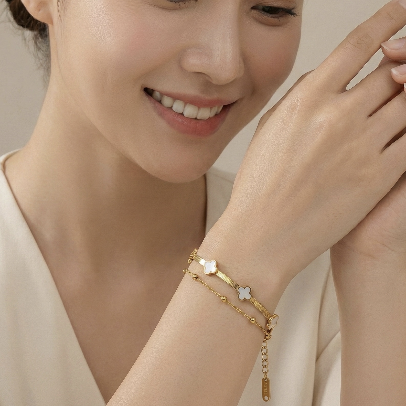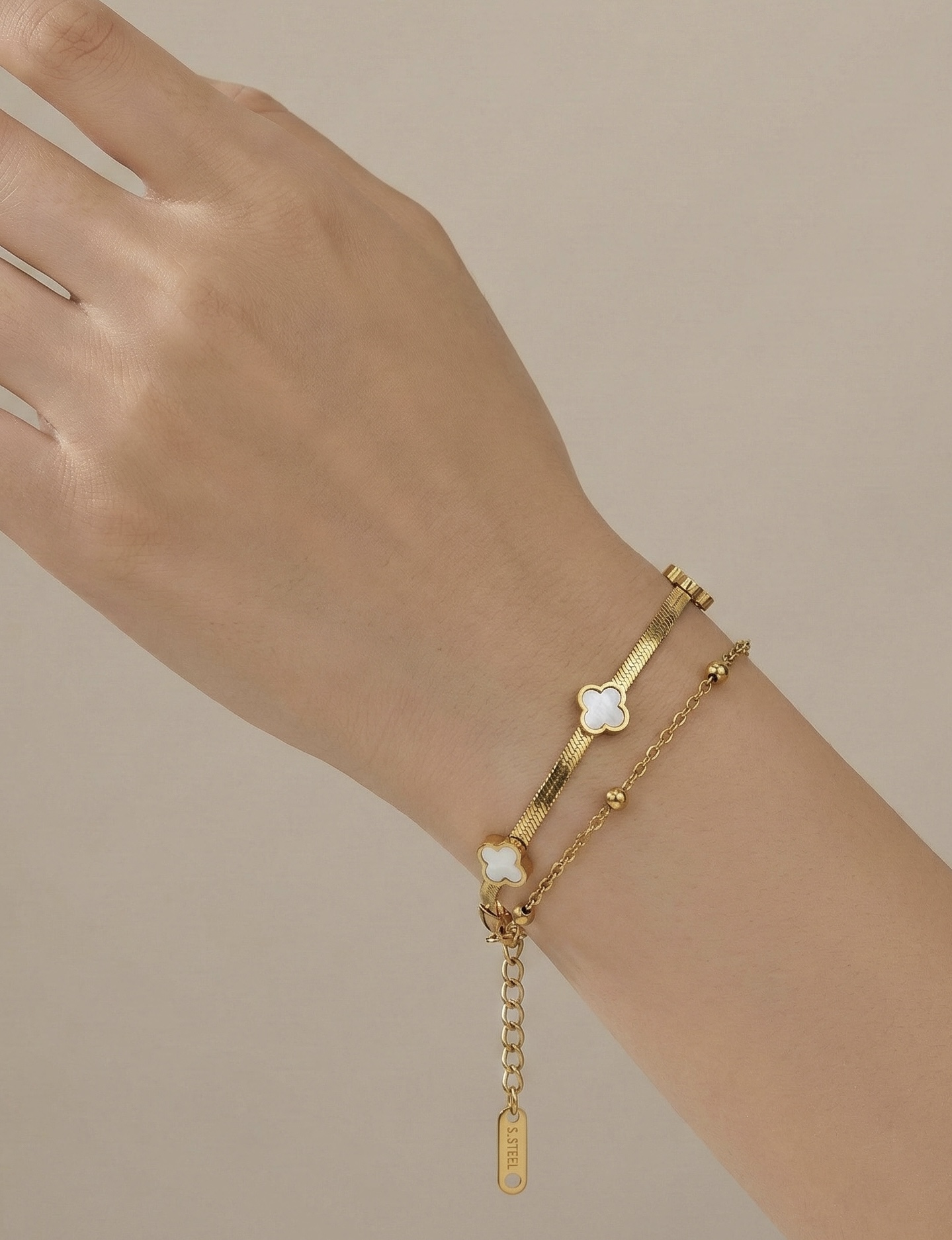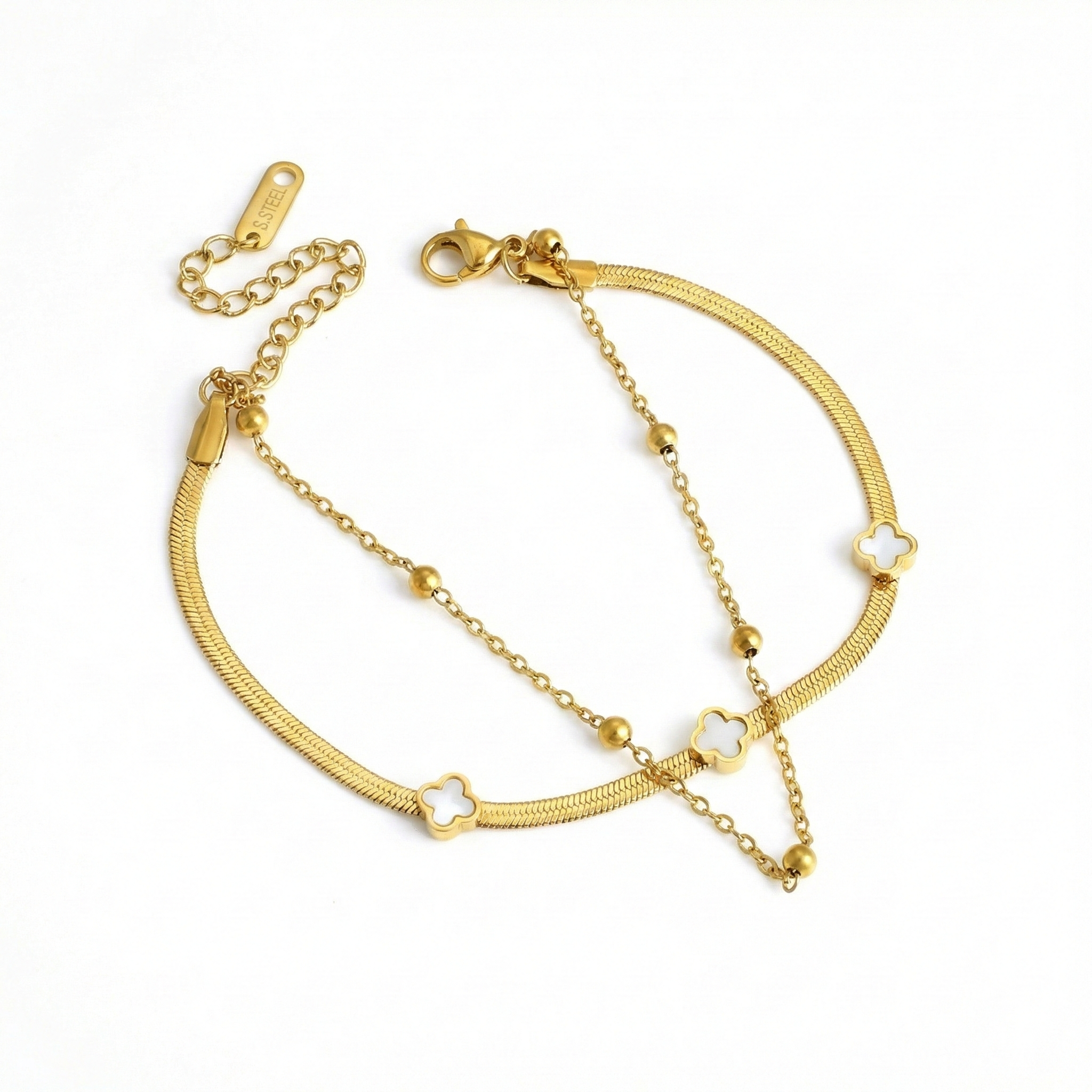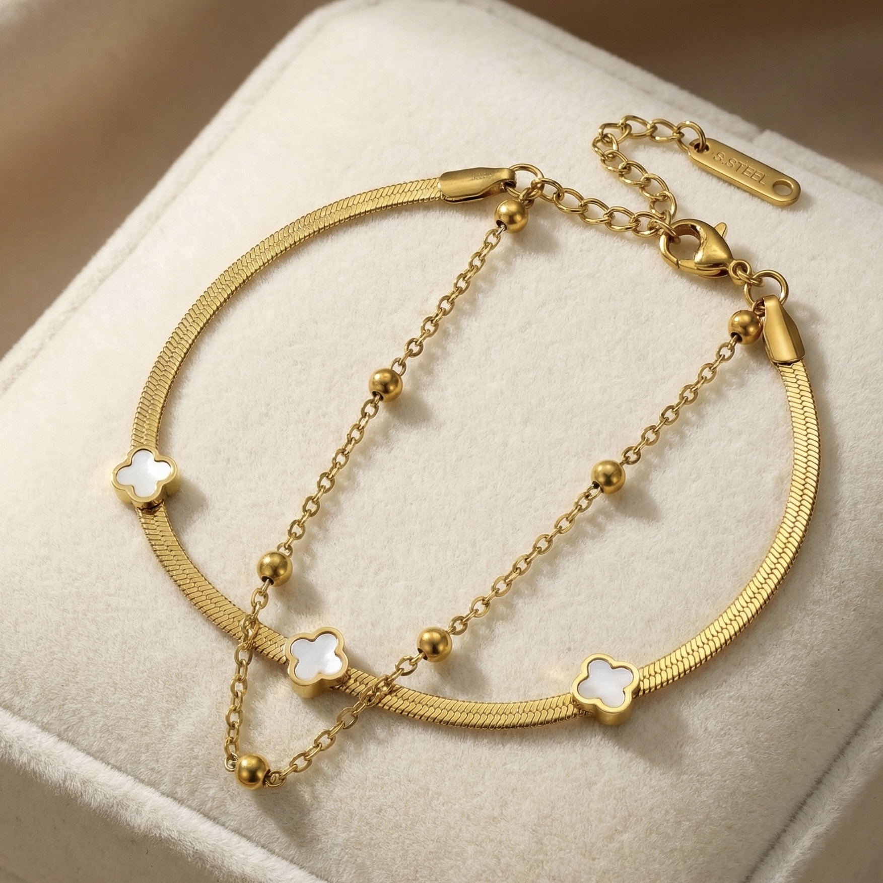Elevate your wrist stack instantly with this exquisite pre-layered piece from Momai Jewels. Effortlessly combining a sleek, liquid-gold herringbone chain with a dainty beaded link chain, this bracelet takes the guesswork out of styling. It is beautifully accented with delicate, white pearl-finish clover motifs, offering a touch of classic charm and modern sophistication.