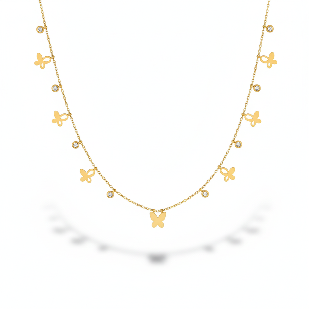 This necklace features multiple butterfly charms thoughtfully spaced along a fine chain, complemented by bezel-set crystals that add a gentle shimmer. The polished gold-plated finish enhances its refined appearance while maintaining a lightweight feel for comfortable, all-day wear.