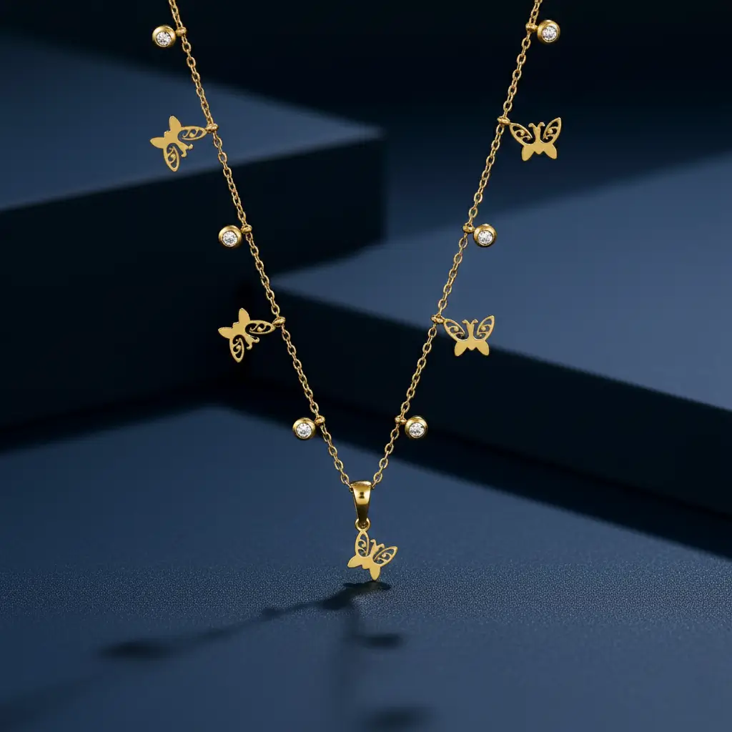The necklace showcases multiple butterfly elements thoughtfully arranged along a fine chain, creating a balanced and sophisticated silhouette. Bezel-set crystals add a gentle brilliance, while the polished gold-plated finish elevates its luxurious appeal without compromising on lightweight comfort.