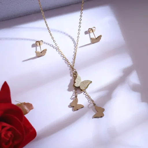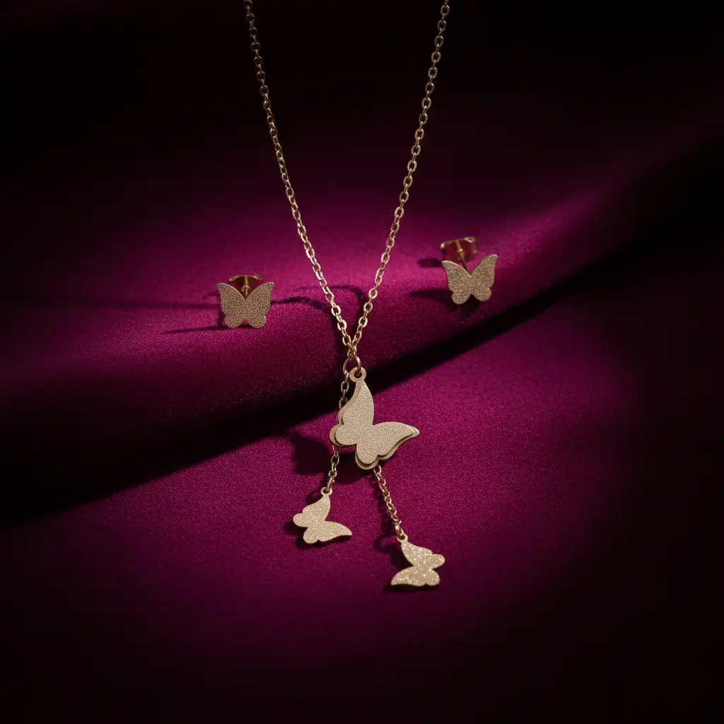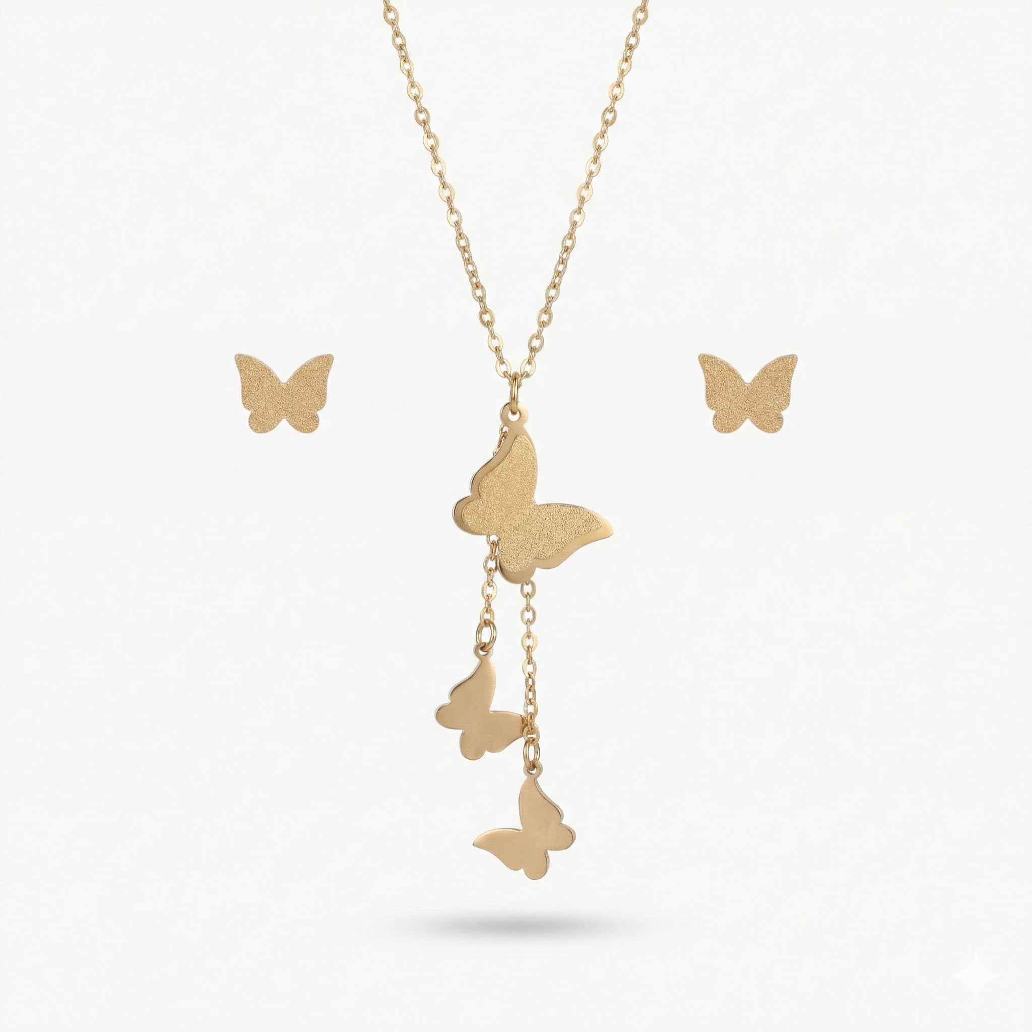 The necklace features a central butterfly charm with cascading butterfly drops, creating a refined vertical silhouette that enhances the neckline. Paired with matching butterfly stud earrings, the set is finished in a smooth yet lightly textured gold-plated surface that reflects light beautifully while remaining understated and elegant.
