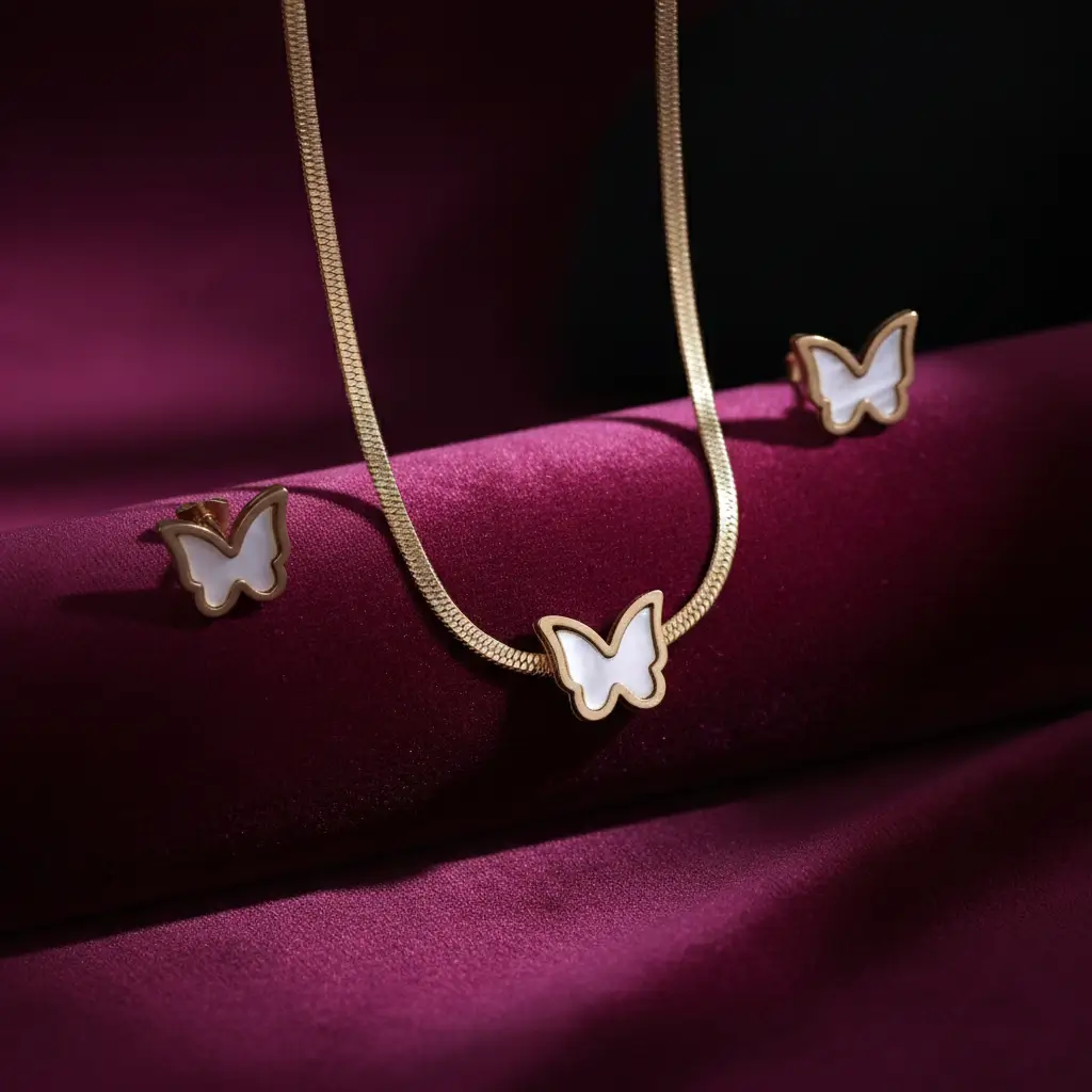 The necklace showcases a sleek, smooth chain highlighted by a butterfly centerpiece, perfectly complemented by matching butterfly stud earrings. The refined gold-plated border frames the inlay beautifully, creating a balanced contrast that feels light, elegant, and versatile for daily wear or special occasions.
