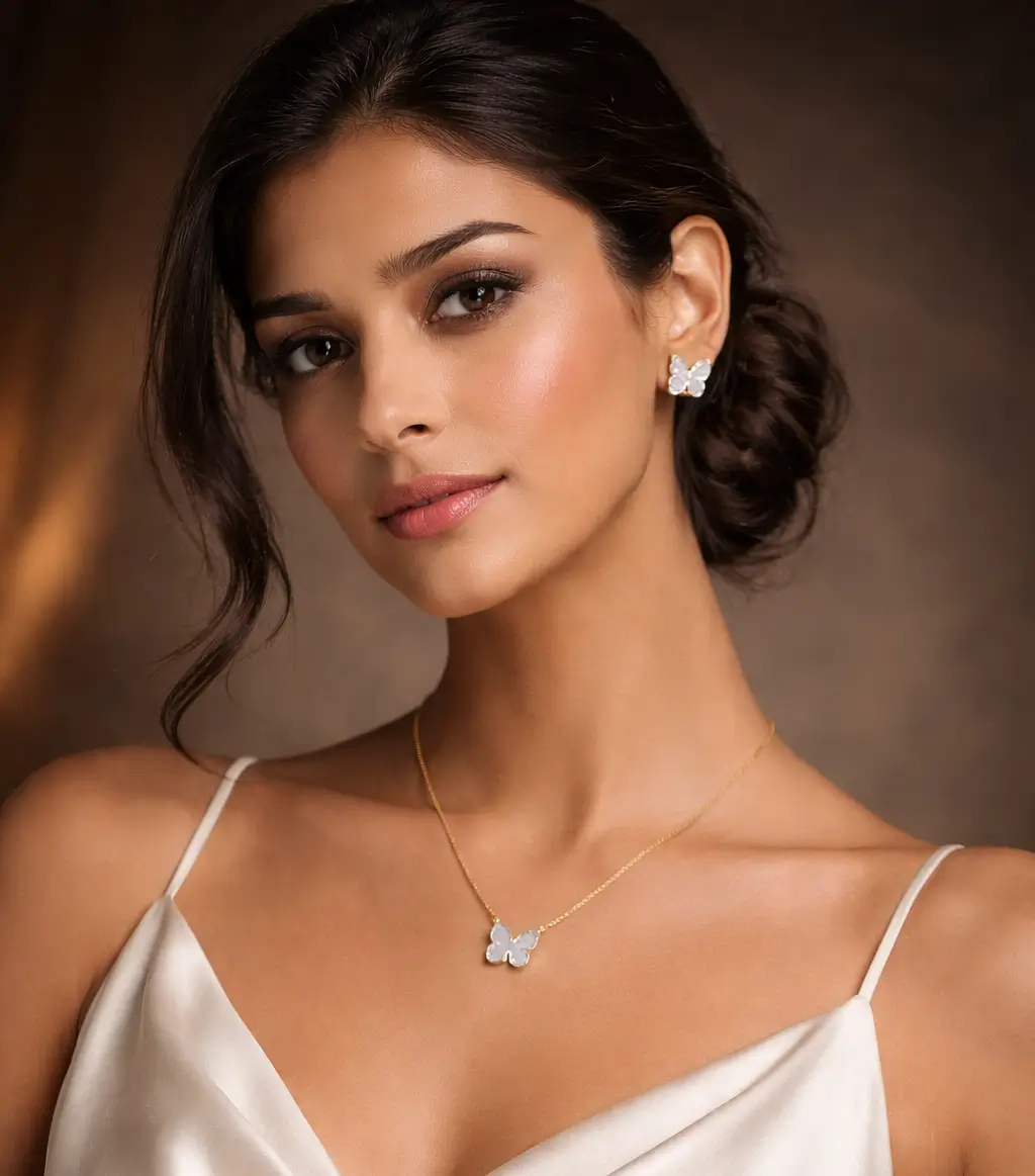 | Design | Butterfly motif necklace with matching stud earrings |