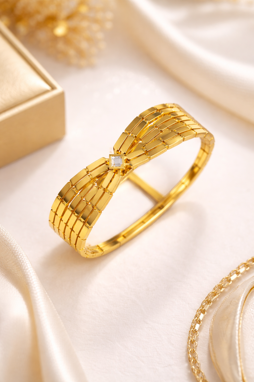 The bracelet showcases a sleek layered band pattern that gracefully converges into a beautifully crafted bow motif. A delicate square crystal detail at the center enhances its luxurious appeal, while the high-polish 18K gold-plated finish ensures a radiant and premium look. Its smooth construction provides a comfortable fit for all-day wear.