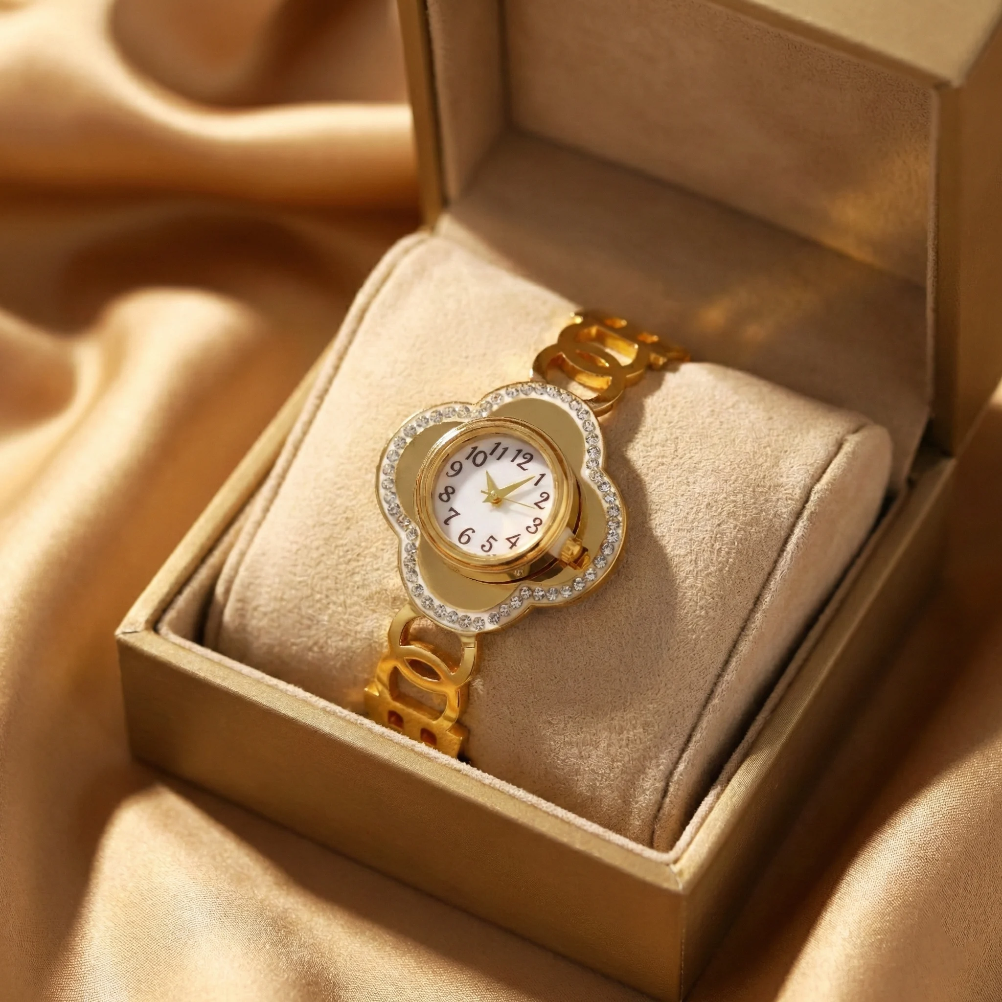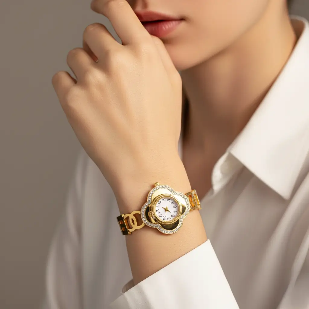 The watch showcases a polished round dial surrounded by a multi-layered floral silhouette that enhances its luxurious appeal. Carefully set crystal accents add brilliance, while the structured bracelet strap provides durability and a comfortable fit. Its radiant gold-tone finish ensures a graceful presence without overwhelming your look.