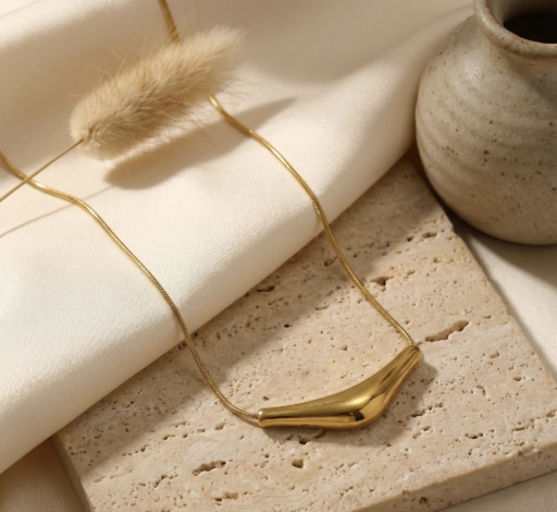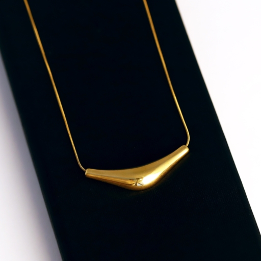 The pendant highlights a fluid curved form with a high-polish surface that reflects light beautifully, creating a refined statement without being overpowering. Suspended from a delicate chain, it offers a balanced combination of durability, comfort, and timeless appeal.