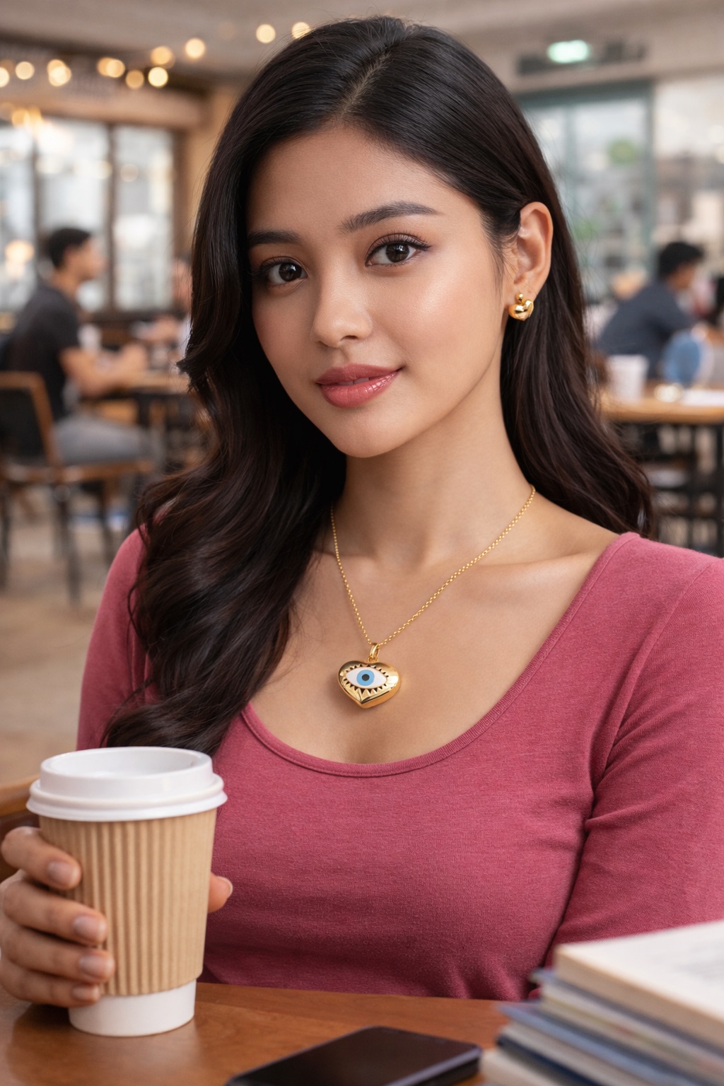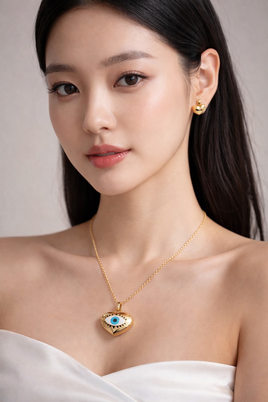 Design Heart-shaped pendant with evil eye motif and matching heart stud earrings