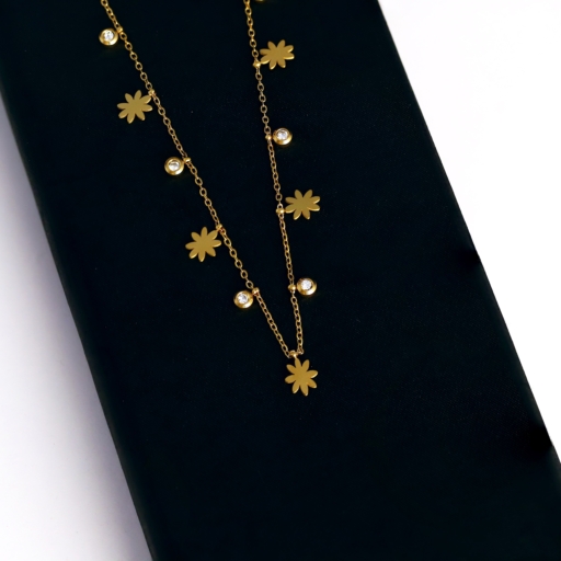 The necklace showcases finely crafted flower charms arranged along a slender chain, creating a balanced and feminine silhouette. Bezel-set crystals introduce a gentle sparkle, while the polished gold-plated finish enhances its refined appeal without adding weight, ensuring comfortable wear throughout the day.