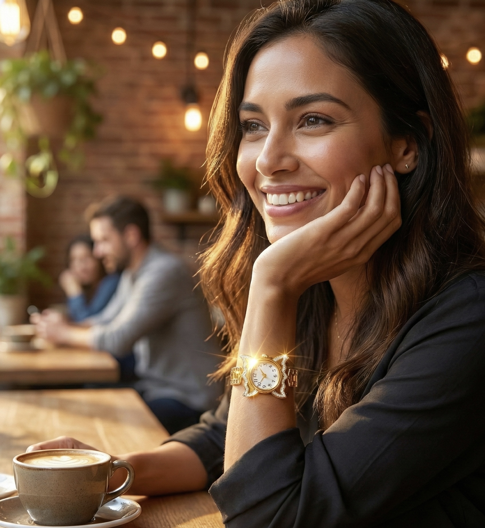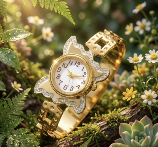 The watch showcases a polished round dial surrounded by a floral silhouette accented with shimmering crystals for a refined sparkle. The structured gold-tone bracelet strap adds durability while maintaining a lightweight and comfortable fit. Its radiant finish makes it a standout accessory without appearing excessive.